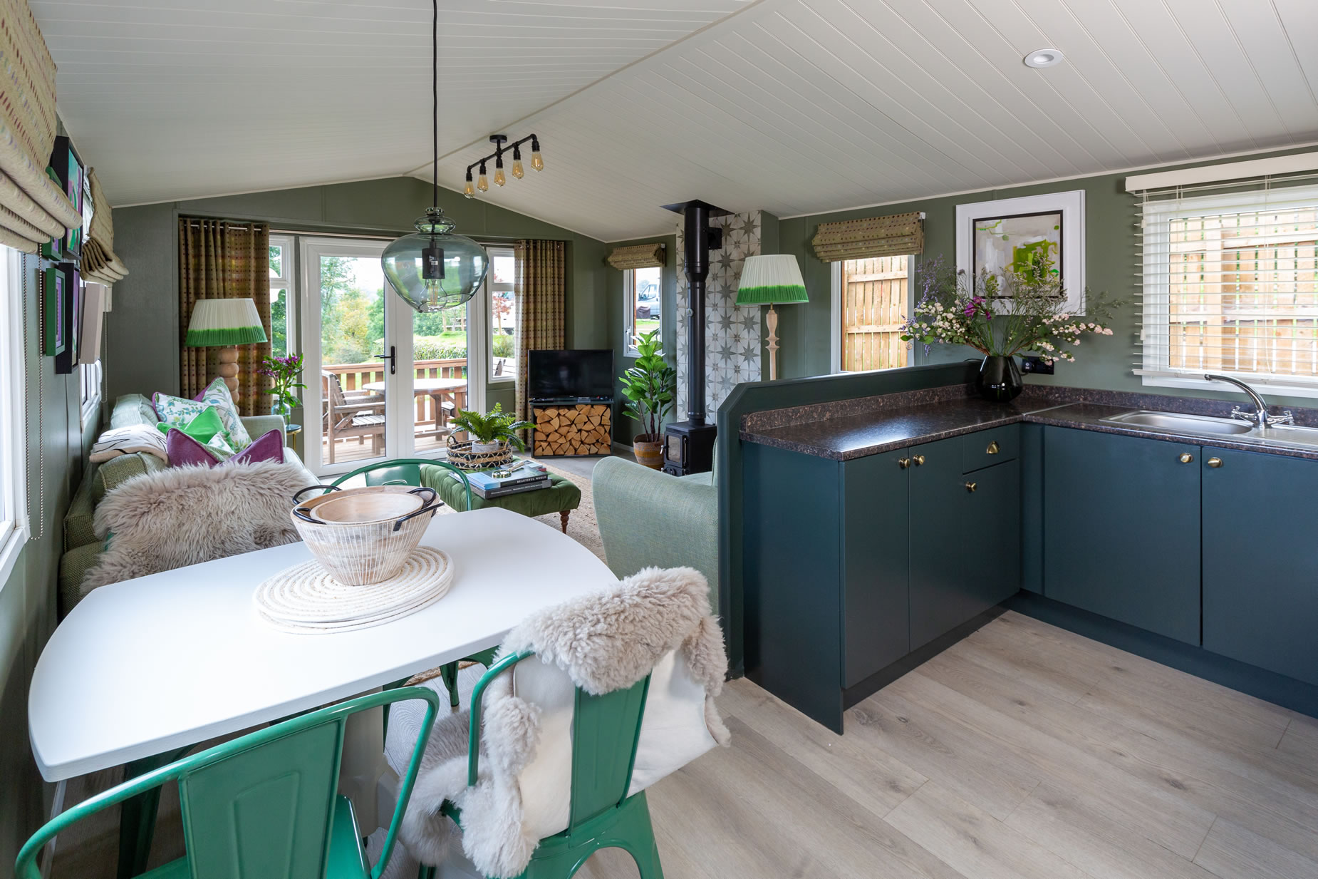 The Shepherd – Field life was the foundation for all the shades of green layered throughout this lodge. Light and bright, it feels quite romantic, especially in the main bedroom where the prettiest powder pink panelling frames the enchanting moss covered dry stone walls outside.